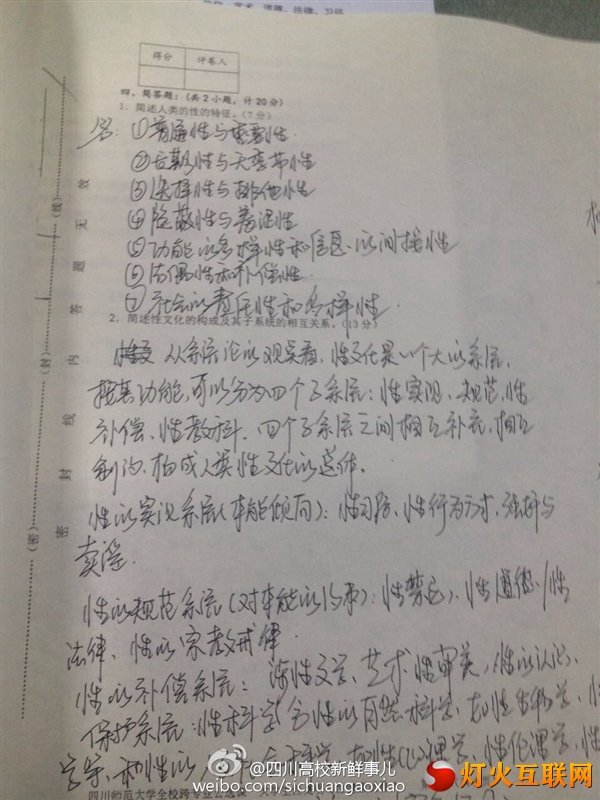 出题者澄清网友误解 对于“约炮”出现在试卷中,有网友认为很贴近现实,大学教育理当如此;也有网友认为,作为正规大学的期末考试,不应出现如此低俗的讨论。 根据网友发布的图片,这是试卷的第五题(论述题,20分),题目原文为:“目前社会上有一种现象,通常不是想恋爱却又有性需求想满足的人,通过网络聊天软件找他人相约见面发生性关系,俗称约炮。作为一名大学生,你认为应当如何看待这种现象?” 确如出题老师所言,首发网友曲解了题意,在传播中引起一些误解。 “大学生如何看待约炮与如何看待大学生约炮,完全是两个概念。”出题者、四川师范大学生命科学学院老师王煜告诉南都记者,设置此题的初衷是希望学生树立正确的性道德和性观念,对“约炮”等虽然没违法却不道德的行为有理性的认识,没想到会被学生传到网上引发争议。 王煜介绍,“大学生性文明与性健康”是四川师范大学的一堂全校选修课,本学期有500多人选修,分两个班,32学时。 “我们在1月4日举行了期末考试,总分100分,那道题的分值是单题最大的,前面还有题目涉及性生理、性心理、性文化等专业知识。”王煜表示,“约炮”这类话题在日常的课程中也曾涉及,该课程的主要内容就是结合当下的社会热点话题,让学生科学地接触、讨论性知识。 “引导学生树立正确的性道德观” 南都记者从该校多个学生处获悉,此课程是学校“最考人品”的选修课,放出来往往几分钟就没了。一个曾上过此课的学生讲述,“我最初是觉得好奇,去听了后才发现真的可以学到东西。” 实际上,这一课程属于四川省精品课程,此前一直由该校政治教育学院副教授田华任课。 田华2013年在接受当地媒体采访时介绍,授课时还会请医生、生物老师、同性恋者从各自维度传播性文化和性知识。近一年,田华被外派到韩国交流,课程便暂由王煜代任。 昨日,南都记者也联系到田华,她认为:“大家对约炮这个词太敏感了。我们在课上的立场是反对这种没有情感基础、没有责任感的行为,引导学生树立正确的性道德观也是开课的重要目的之一。” 王煜表示,根据此前所做的调研,当前大学生在性方面的不良行为有一定数量。“光靠这一门课肯定难以改变很多,但我们也希望做的努力能得到理解,更希望得到社会各界的帮助。” 图片:357685.jpg ![]() | |