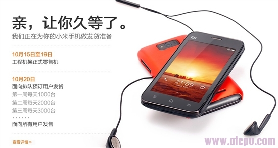 ![]() | 今天下午5点,小米在其官方网站上正式公布了小米手机零售版公告,2011年10月15日将会正式向工程机用户提供换机服务,而之前预订用户需要等到10月20日小米网新版正式后才会开始发售,与此同时第一期的配件产品也会同步上线。 具体公告如下: 发货时间安排: 10月15日—19日:小米手机工程纪念机无条件更换正式零售机,运费将有小米承担,当然工程机用户可以保留带有编号的纪念机后盖。 10月20日:面向参与预订的30万用户发货(含5000个论坛荣誉预订用户),同时基于产能的逐步攀升,发货量也将逐步增加,10月20日之后的第一周每天1000台,第二周每天2000台,第三周每天3000台........。另外5000台的论坛荣誉预订用户与普通预订用户会同时发货,小米也会每两周更新发货量的安排。 30万台预订用户发货完毕后,将面向所有用户进行发售。 关于支付方式及购买方式: 小米手机目前仅支持在小米网线上购买,支持在线支付、货到付款两种方式,货到付款目前仅支持现金支付,随后会开通POS机刷卡服务。 在线支付方式,订单金额大于200元,免运费。 小米手机的售后政策: 小米手机提供三包服务政策,其中包括了7天免费退货,15天免费换货以及12个月保修,另外,小米手机还将陆续开通全国多个城市的小米之家服务站,为大家提供线下更方便的上门自提,退换货、维修、软硬件等售后服务。 小米手机的原装配件: 在小米手机发货后,小米网第一期提供多种常用的手机配件,包括贴膜、挂绳、彩壳、后盖、耳机、布袋、SD卡等产品。 图片:107_3710_9cff9b72894236f.jpg 小米手机零售版及优化改进项目 | |