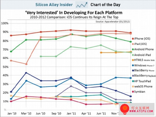 ![]() | 来自IDC 的最新报告显示:开发商对Android手机及平板电脑应用的开发兴趣正持续下降,本次调查“围绕开发商最想为哪些平台开发应用”而访问了1869位开发商。更多信息,请看下图。在这个季度,开发商对Android手机应用的开发兴趣下降了4.7个百分点,降到78.6%,对Android平板电脑应用开发的兴趣下降了2.2个百分点,降到65.9%.虽然调查存在一些误差,但这也表明了一个趋势,虽然Android设备销量在增长,仍旧留不住开发商的心,开发商对Android 的兴趣在过去四个季度持续下降。 这个调查对不论对ios还是对Android都非常重要,关系到两大移动平台大战谁胜谁负,之前施密特还有许多媒体都对Android平台信心满满,认为它会取代iOS成为移动平台的主导,然而,现在相反的事情发生了。 当然,这里存在一个重要因素,由于HTML 5的兴起,各大开发商开始考虑开发能够跨平台运行的应用。 | |