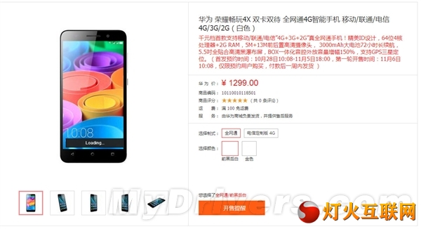 具体配置方面,荣耀4X采用5.5英寸720p显示屏,搭载四核1.2GHz骁龙410处理器(64位A53架构),内置2GB内存和8GB机身存储空间,提供一颗500万像素前置摄像头和一颗1300万像素后置摄像头,电池容量3000mAh,运行基于Android 4.4的EMUI 3.0。 该机按照网络制式分为电信版和全网通版,其中电信版仅支持电信2G/3G/4G网络,售价999元;而全网通版则通吃国内任何2G/3G/4G网络,售价1299元。 今天上午10点08分,该机将正式在华为商城和京东商城开卖,用户可选999元的电信版以及1299元的全网通版,但仅限预约用户购买。 | |