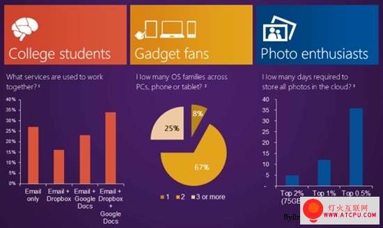 ![]() | 微软集团项目主管在一篇关于SkyDrive的文章中表示,Windows 8将成就一个前所未有的好机遇,让成千上万的PC用户享受到云计算的好处。SkyDrive是微软在2007年8月发布的一款针对消费者的云计算产品,在消费云计算领域,它是一个主要玩家,另外还有苹果iCloud、亚马逊Cloud Drive等。 在9月份,微软对SkyDrive与Windows 8的无缝协作进行了预览,并且发布了一个API的预览版,帮助Windows 8和其它开发人员将SkyDrive整合到应用程序中,更加方便地访问、共享文档和照片。“微软提供了一个绝佳的好机会,将个人云的好处带给了无数的PC用户。” 微软将个人云计算方案划分为三个类别: — 文件云:采用传统的文件和文件夹架构,例如SkyDrive、Dropbox; — 设备云:以设备为中心的云存储,为你“隐藏”本地文件夹,例如iCloud; — 应用程序云:完全拥抱云计算,提供了一种全新的协作、组织、分享方法,例如google Docs、Evernote。 微软认为,大多数用户才刚刚开始试着使用个人云计算产品。根据微软的调查统计,22%的用户在线存储他们的照片,1%在线存储文档,其他人仍然习惯于将所有文件存储在本地PC上。 微软还发现了三组用户群是非常有潜力的个人云用户:大学生、技术爱好者和照片爱好者。 图片:19_3710_61abb94ccb964fb.jpg 微软提供了一组SkyDrive在10月份的统计数据: — 每月有1700万用户在SkyDrive上存储数据; — 这些用户每月分享了3.6亿份文件; — 每月有500万台设备连接到SkyDrive。 | |