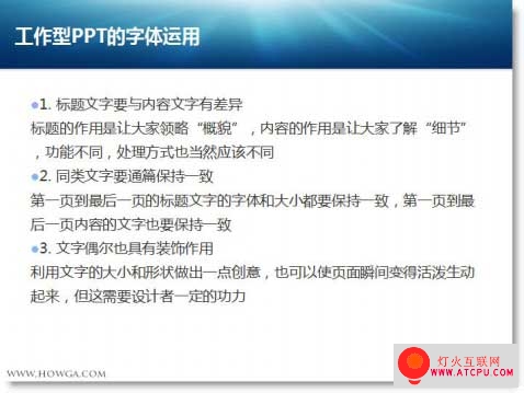 ![]() | 很多朋友都知道文字是[backcolor= transparent]PPT的天敌,对于工作型的PPT如何处理文字就又是一个难题了,今天就来说说这个主题,让文字犹如花瓣在风中飞舞般美丽。 我想这个主题肯定有很多人谈过,无非谈些字体颜色啊,字体啊,其实都是一些让文字变得“醒目”的方法,在我看来,这没必要去谈,我今天想讲的是工作型PPT中段落的文字处理。 以上这页PPT就是典型的工作型PPT,文字蛮多,也有项目符号。这种就是比较初级的PPT使用者做的页面,当然咯,估计各位看官不会做出这样的PPT页面。对了,这个PPT页面上的文字,你们要看看的,这是这篇[backcolor= transparent]PPT教程的技巧总结。 中级PPT使用者一般会把那个典型PPT错误范例做优化,因为毕竟是中级水平了嘛,一般呢,他们会做以下几步优化工作: 拉开PPT段落间距。这样使得3个段落更为清晰 小标题字体和正文字体做变化。这样可以让读者一下子看清主要脉络 PPT元素对齐。把三段文字均进行左对齐,以显得比较工整 必须说,这个思路很不错的,是有点水平的思路。但是问题是,怎么看还是有点土啊~~~ OK,一般高手呢是这样做的: 1.增加PPT图片做美化。至于选什么图,这个图放什么位置,这就考验设计者自身的设计水平了 2.用横线分割空间。为什么要这么做呢?各位朋友,你们自己想想看,琢磨一下 3.给图片加个标注。加标注也是有讲究的,这个标注不是什么词都可以用,至少我是这么认为的。我开始起的三个词是“Different(不同)—Same(相同)—Decorate(修饰)”,后来我换成了“Different(不同)—Repeat(重复)—Decorate(修饰)”,为什么我要这么做?你现在是不是应该承认,做PPT是个系统工程了吧。呵呵 Lonely Fish不会满足于仅仅做个“较为美观”的页面,上面一个页面是想告诉大家,文字段落的美化的高阶技巧,这个页面希望告诉大家:文字不是仅仅是文字,如果使用的恰当,它完全可以具备修饰的功能,美化的功能,前提条件是你需要储备一些[backcolor= transparent]PPT字体。 以前我给大家讲PPT时候,更多的是谈页面设计,其实那是相对比较肤浅的东西,因为毕竟老总看你的PPT,第一个是“印象”,这个靠PPT页面设计,如果PPT页面不难看,至少他愿意读下去,或者多花点时间读你的报告,但顶多就这点作用了;第二个是“内容”,这个绝对不是你一天两天就能搞得定的东西,这个是靠长期积累的思维习惯和思维深度决定的,所以我建议大家从今天开始,多注重培养一些良好商业逻辑思维。 今天就谈到这里了,谢谢大家. | |