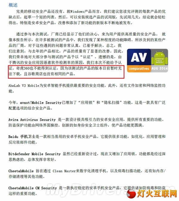 ![]() | AV-Comparatives(AV-C)是国际上最权威的安全软件评测机构,其排行和评语向来都是安全界的标杆。近日,AV-C修订了其2014年9月份“移动安全软件评测”(简体中文版PDF官方下载),奇虎360提交的“360手机杀毒1.0.0”因为存在作弊行为而被除名。