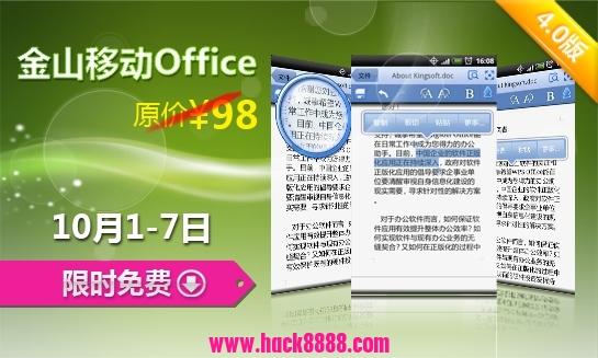在国庆长假期间(2011年10月1日-7日),下载安装Kingsoft Office移动版办公软件4.0版的用户,联网输入邮箱即可免费升级至98元全功能正式版(无时间限制)。