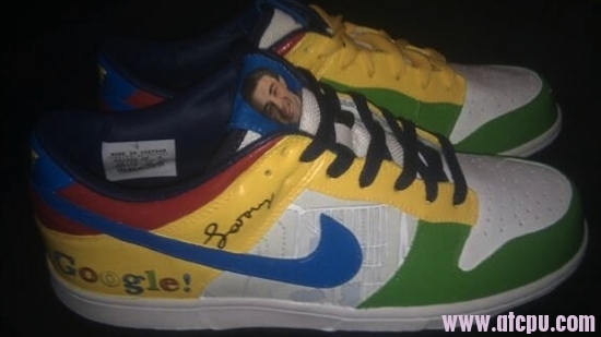 好吧,它确实有着代表Google的蓝红黄绿四种颜色,它的鞋跟处还有复古的Google logo(带有惊叹号的那种有木有),它的舌头处居然还印着Larry Page那销魂的大头像,哦他们还悄悄地在侧面白色处加入了若隐若现的Google Maps地图?我去,鞋帮儿上居然还有Larry Page的亲笔签名!从里到外彻彻底底的Google范儿!