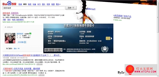 在百度中搜索“拯救地球”或“2012世界末日”(支持IE9、Firefox、Chrome、Opera浏览器),就会出现一个小小的惊喜。搜索页面就会呈现2012特效,如地壳般崩裂,然后飘落一张“百度2012拯救地球号登船卡”,点击即可进入活动页面。
