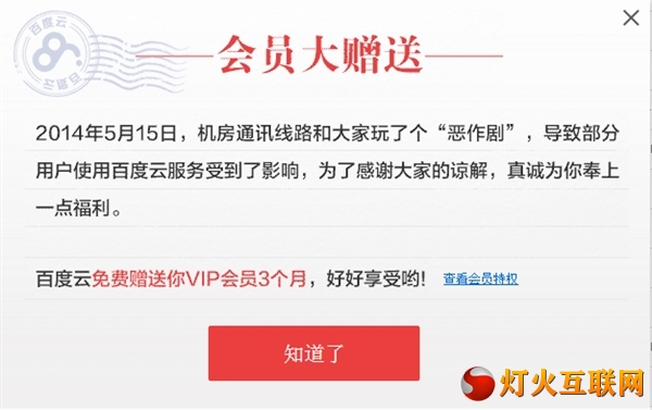 ![]() | 百度网盘在官方贴吧发布消息,在5月15日百度云故障期间(8:30—11:45)登录过的所有用户,均可免费获得百度云VIP会员3个月。