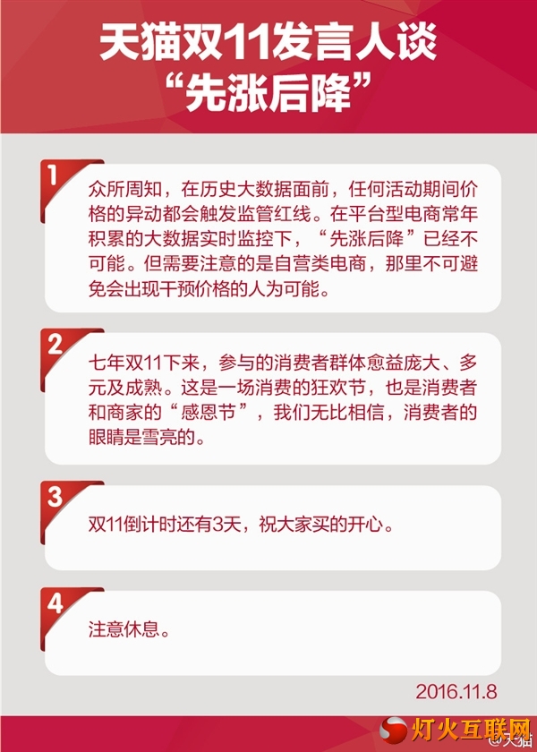 放出了一张图片,内容是天猫双11发言人谈“先涨后降”。