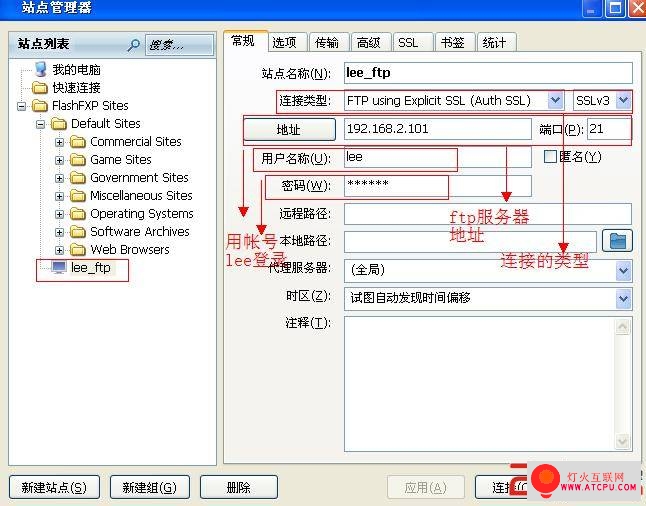 在客户机上安装一个ftp客户端FlashFXP 安装之后,新建一个站点,如图: