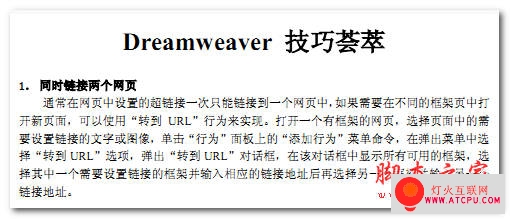 ![]() | 图片:161436162109.jpg 1. 同时链接两个网页 通常在网页中设置的超链接一次只能链接到一个网页中, 如果需要在不同的框架页中打 开新页面,可以使用“转到 URL”行为来实现。打开一个有框架的网页,选择页面中的需 要设置链接的文字或图像,单击“行为”面板上的“添加行为”菜单命令,在弹出菜单中选 择“转到 URL”选项,弹出“转到 URL”对话框,在该对话框中显示所有可用的框架,选 择其中一个需要设置链接的框架并输入相应的链接地址后再选择另一个框架并输入另一个 链接地址。 2. 不要为网页文件使用中文名称 在制作网页时,初学者起一个容易记忆的中文名称作为文件名,这种做法是不正确的。 因为Dreamweaver 对中文文件名称支持得不是太好,经常会有页面调用不正确的现象发生, 所以在 Dreamweaver 中保存网页的时候,尽量使用英文或者数字作为文件名称,这样就可 以避免上面的出错现象。 3. 设置不同分辨率 制作好的网页在本地计算机上浏览时很正常, 但在另外一台计算机上浏览时发现原本漂 亮的网页变得歪歪扭扭了。这主要是因为每台计算机的分分辨率不同所导致的,为了使所制 作的网页在不同分辨率的计算机上都能正常显示,在 Dreamweaver 中得到了较好的解决, 在文档窗口的右下角,Dreamweaver 显示当前文档被设计成的分辨率大小。单击数字,在 弹出式菜单中可以为当前的页面指定显示分辨率,通过修改可以使设计的网页更具灵活性, 使不同分辨率的显示器都能较好地显示。 点击下载 | |